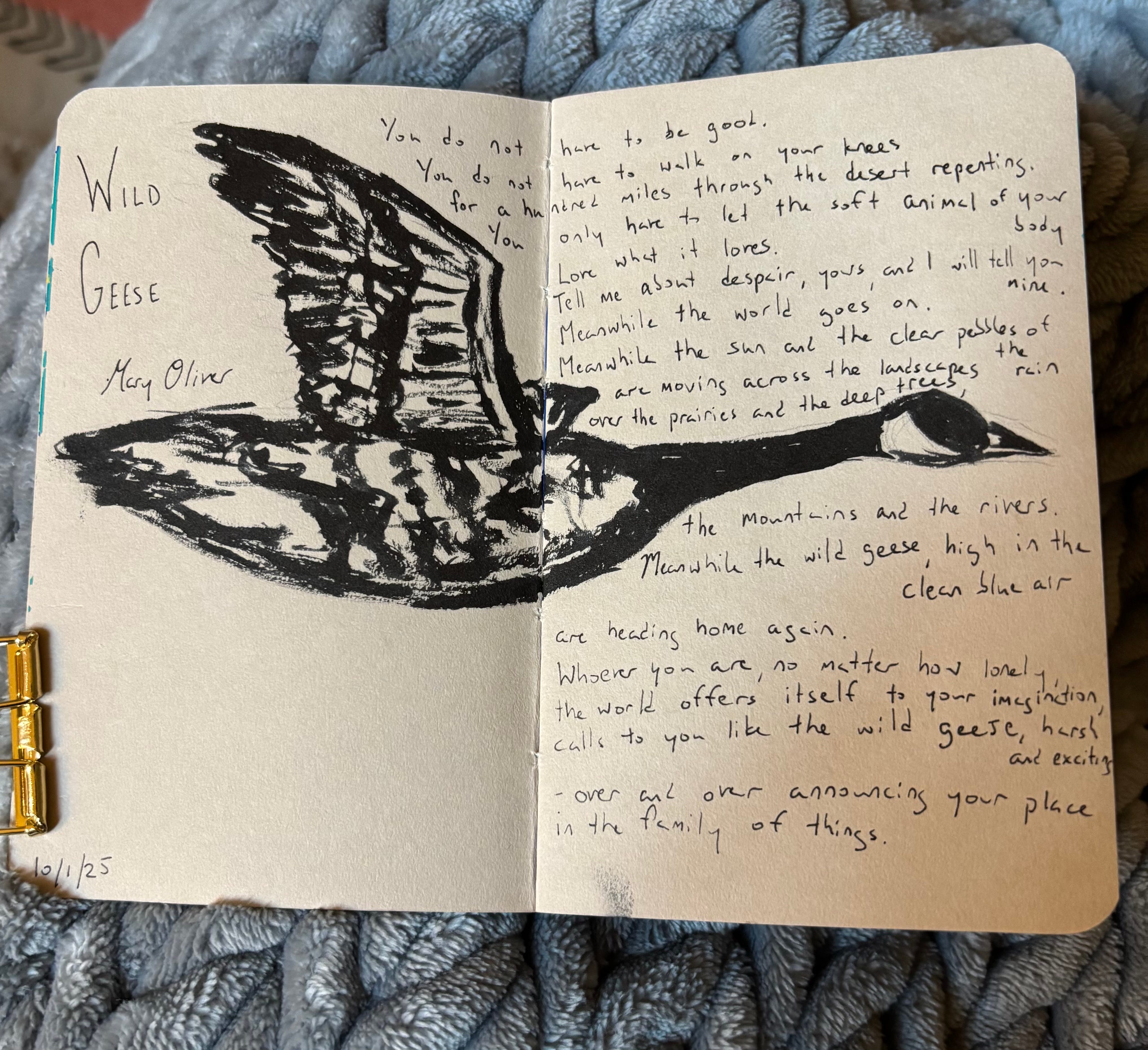 (“Wild Geese” is one of my Mary Oliver favorites. If you don’t know it and can’t read my handwriting, here’s a link to Mary Oliver reading the poem aloud.)
